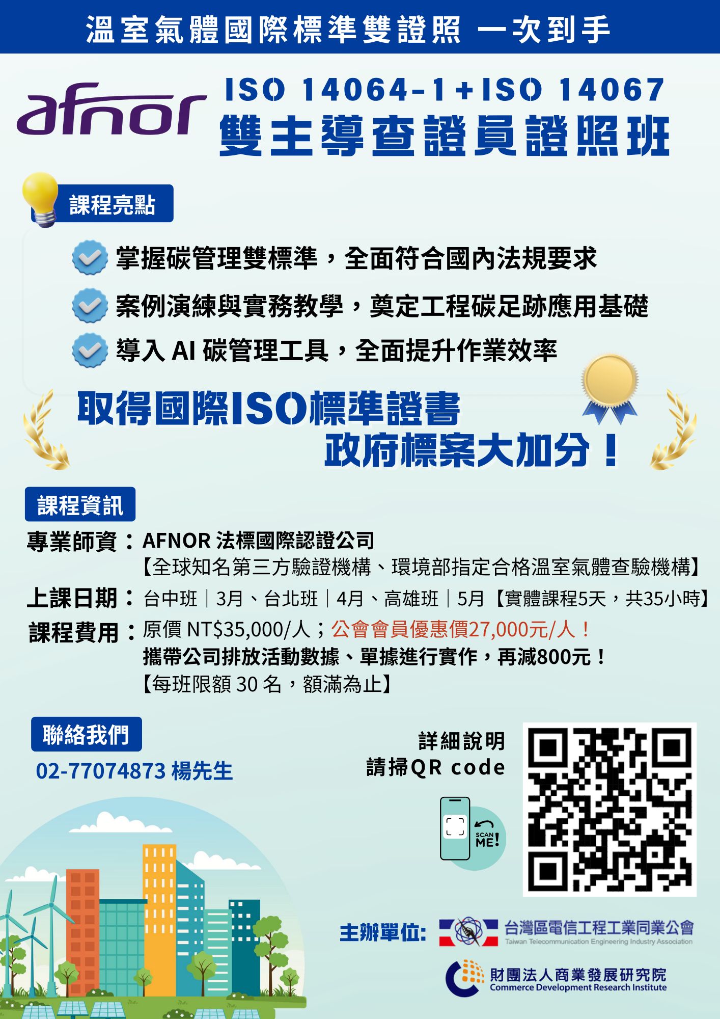 原價NT$35,000/人,台灣區電信公會會員優惠價27,000元/人!攜帶公司排放活動數據、單據來現場實作,再減800元。